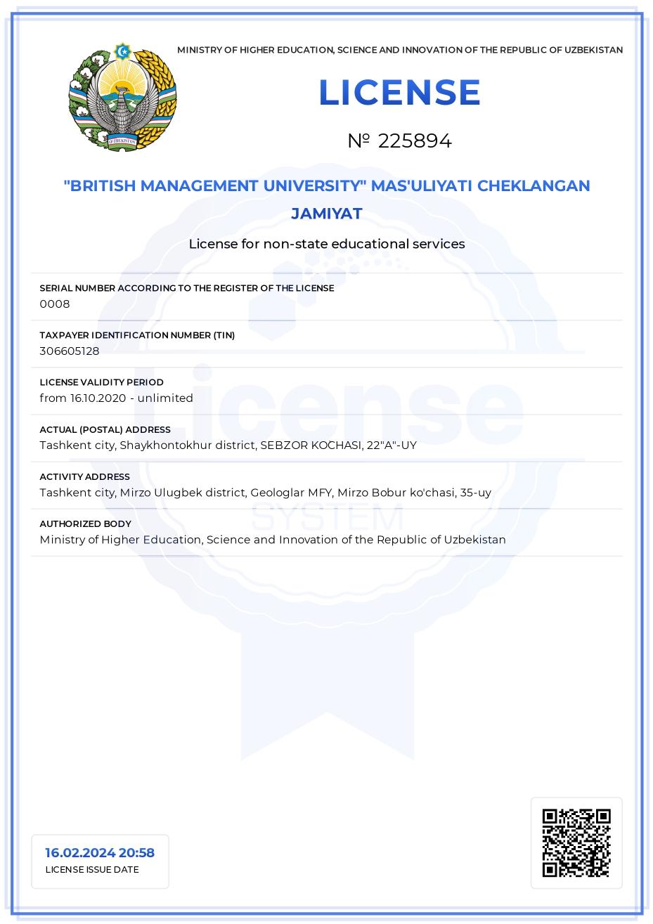 Founded in 2020 following a Presidential Decree of the Republic of Uzbekistan,British Management University (BMU) was established in response to the national strategy to diversify higher education. BMU’s mission is to be the leading management university in Central Asia, recognised globally for educating innovative leaders and creating positive societal impact.